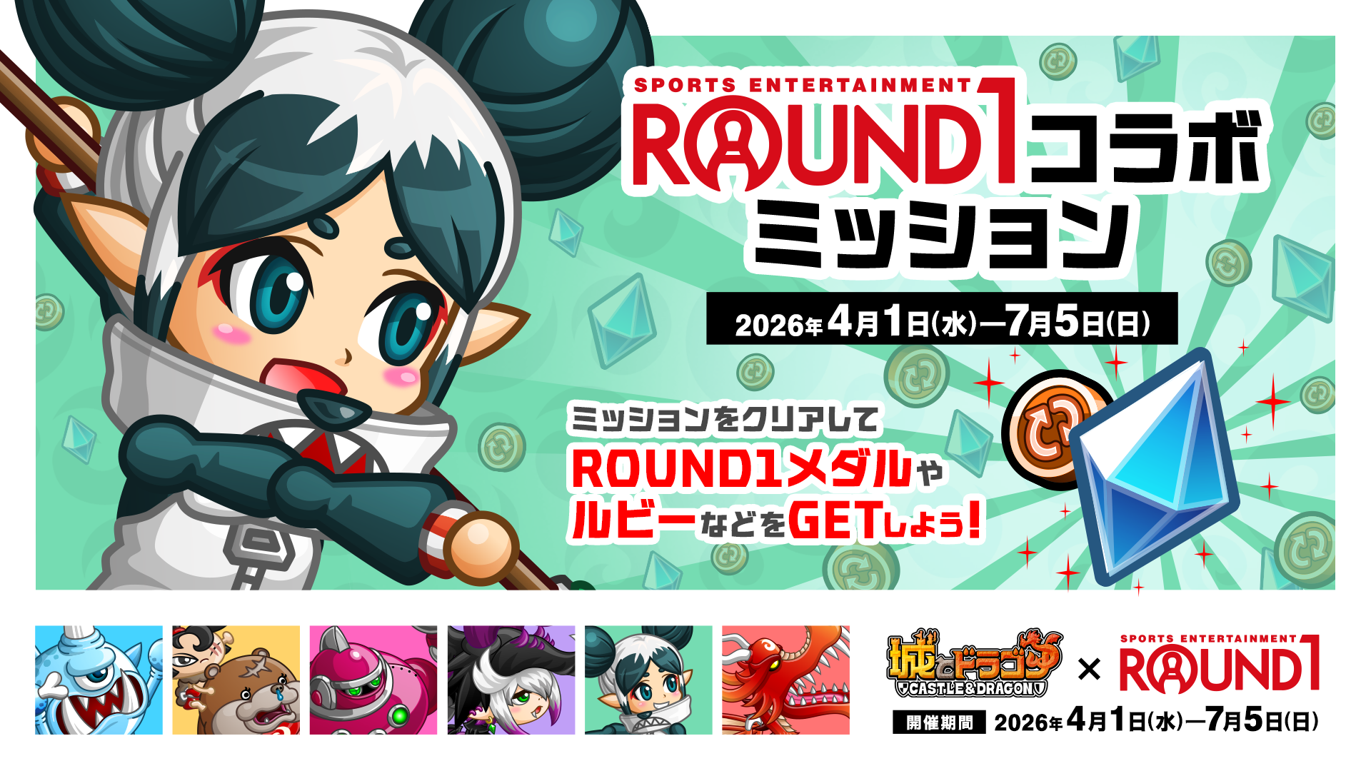 コラボ期間中さまざまな「コラボミッション」を達成すると、「ROUND1メダル」「ルビー」などがもらえます。